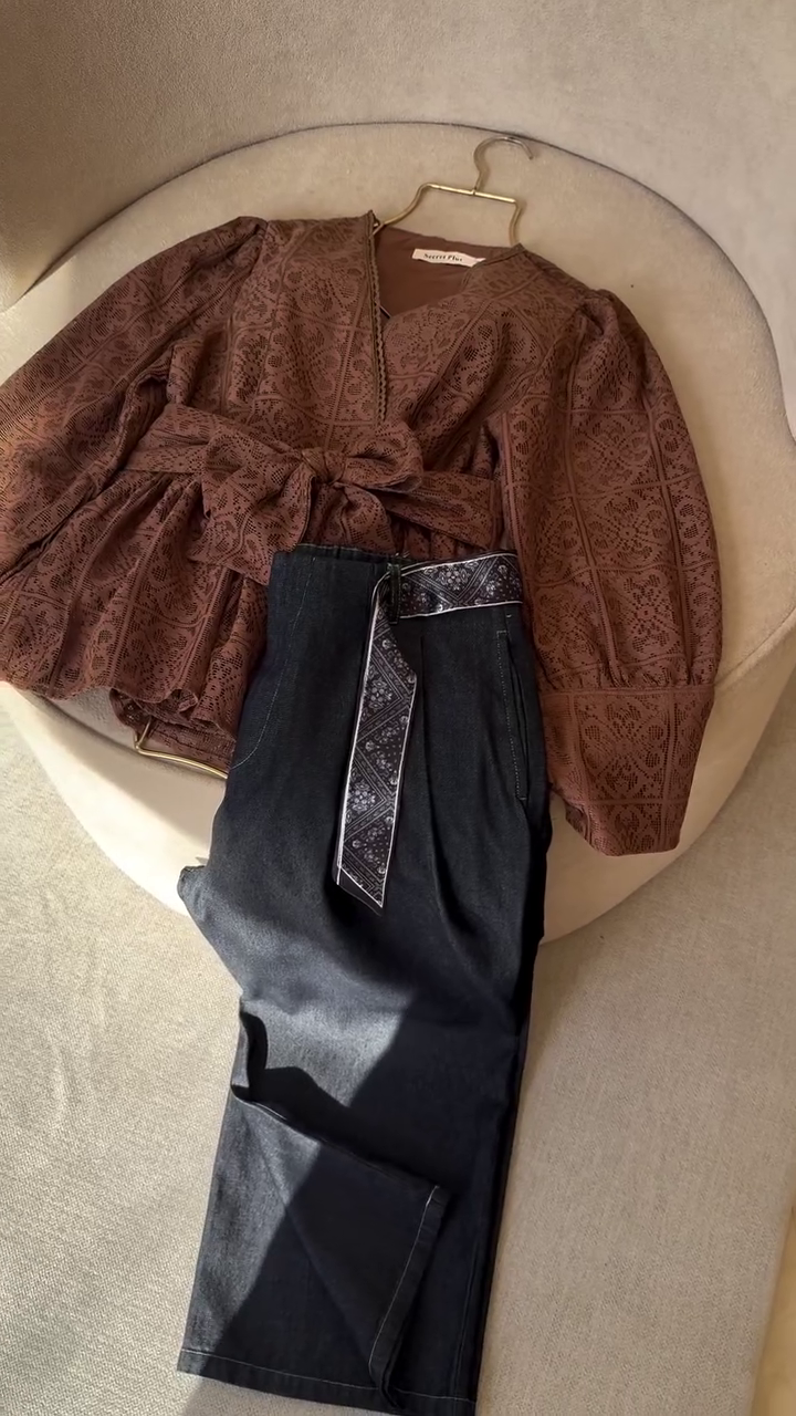 Adding a contemporary and fashionable touch is the patterned belt 🎀. This statement accessory elevates the outfit by introducing subtle contrast and visual interest, drawing attention to the waist and enhancing the overall aesthetic. The belt also allows flexibility in styling, as it can be tied in different ways to suit your personal taste.