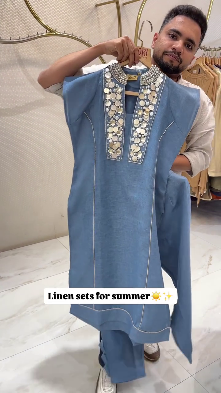 + Free Shippingβ¨ Elegant Linen Kurta Set β Sequins & Bead Embellishments for a Festive Glow πΈ