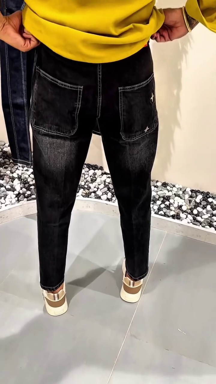 The tapered leg design creates a clean, modern silhouette that flatters every body type, giving you a sharp look without sacrificing comfort. Detailed stitching, functional front pockets, and a minimal branded tag elevate the overall aesthetic, making these jeans a standout piece in any wardrobe 👌.