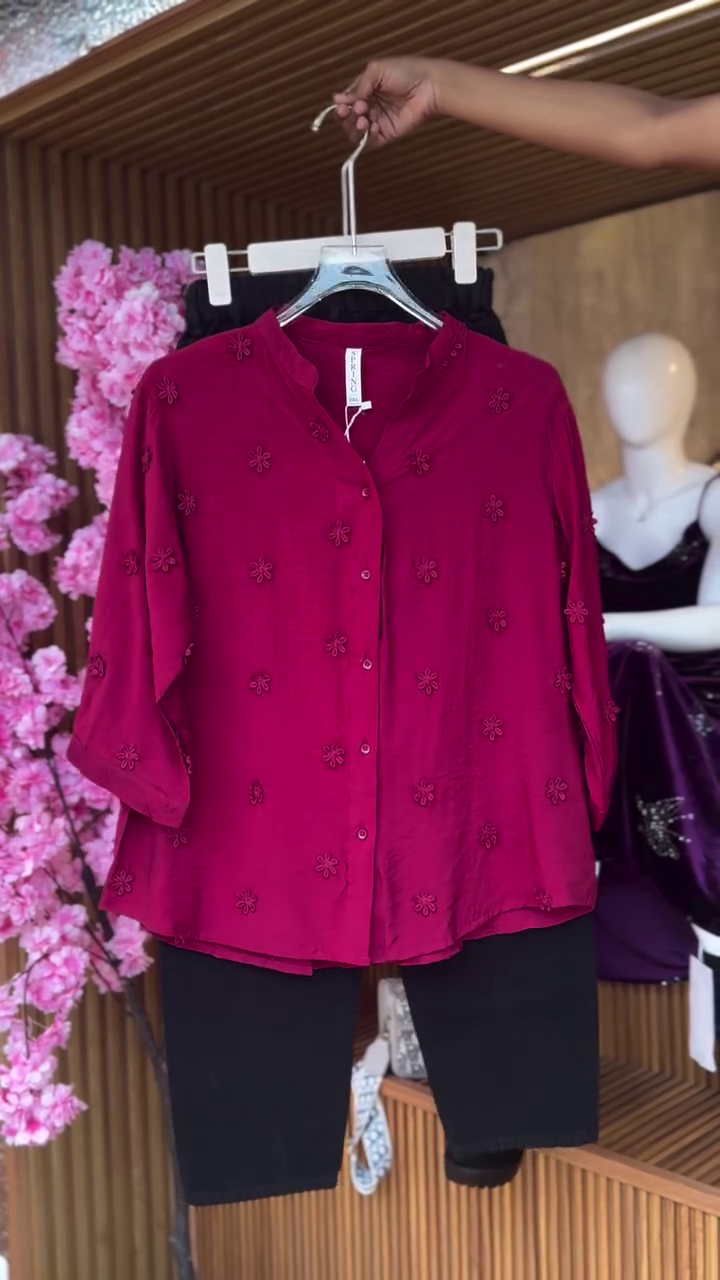 The deep maroon hue embodies rich tradition, while the delicate thread-embroidered floral motifs add an artisanal touch that celebrates handcrafted artistry. Its button-down front and mandarin collar bring a refined yet relaxed appeal, suitable for any age group. The ¾-length sleeves and breezy fit allow effortless movement, ensuring comfort through long hours.