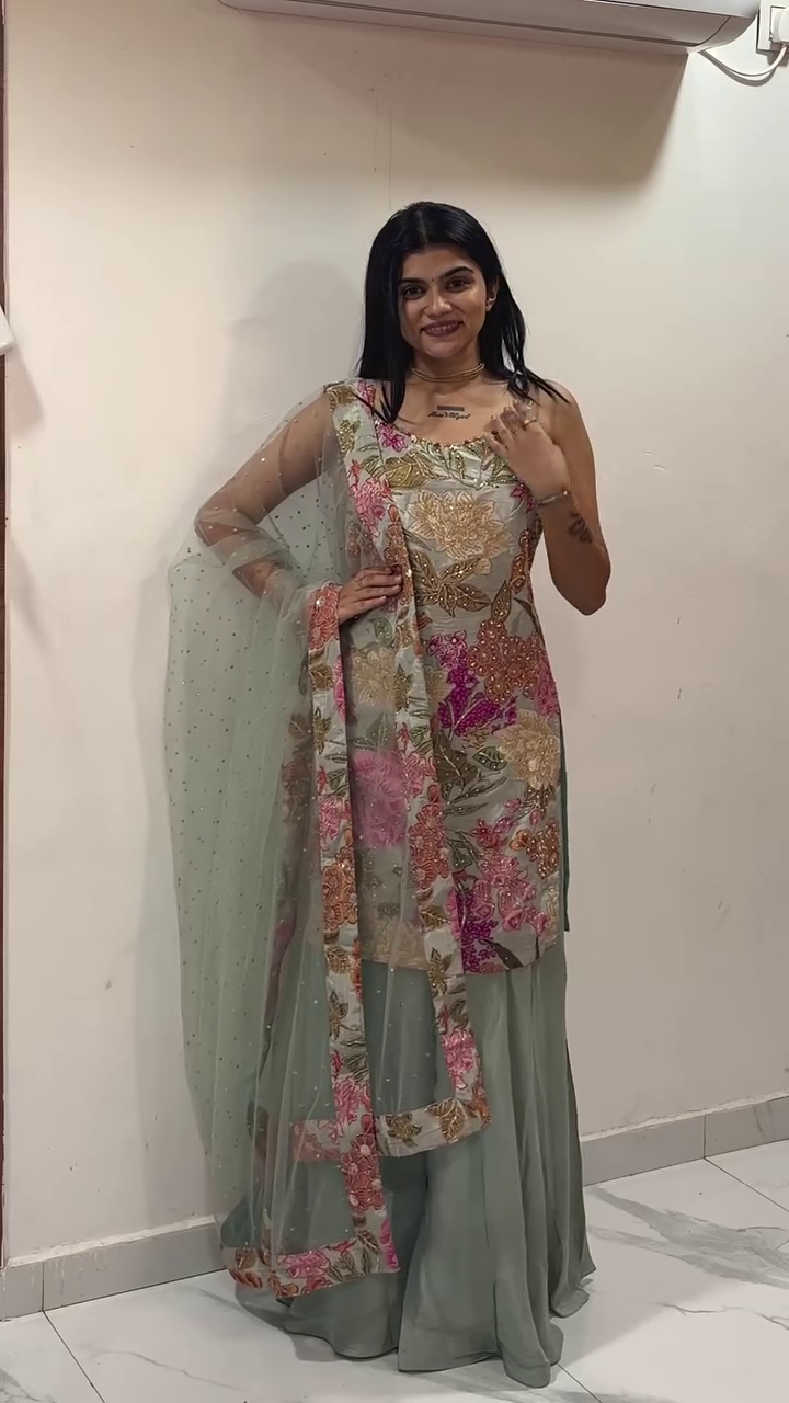 Step into graceful sophistication with our Mint Blossom Embroidered Sharara Suit, a dreamy ethnic ensemble designed for women who love soft hues, intricate detailing, and effortless elegance โœจ๐ŸŒธ. Perfect for festive gatherings, weddings, daytime functions, engagements, and intimate celebrations, this outfit brings together modern charm and traditional craftsmanship in the most beautiful way.