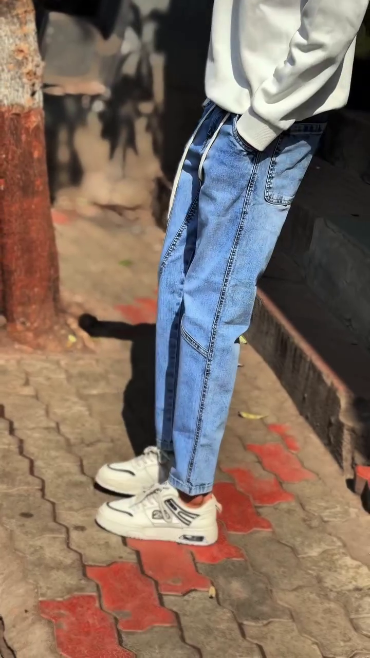These jeans come in a fresh light-wash blue denim with stylish panel stitching and a unique cargo pocket detail that instantly gives a premium urban look ๐. The standout feature is the elastic waistband with long drawstring โ โ giving you the comfort of joggers with the style of jeans. No tight waist, no stressโฆ just pure comfort and clean fashion ๐ฏ.