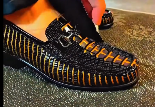 These loafers come in a bold black base with a rich gold cut detailing pattern that instantly gives a high-end designer look ๐Ÿ–ค๐Ÿ’›. The upper is fully decorated with premium crystal/stone work ๐Ÿ’Ž๐Ÿ”ฅ, making the shoe shine beautifully under lights โ€” perfect for weddings, parties and grand occasions โœจ๐Ÿ’ฏ.
