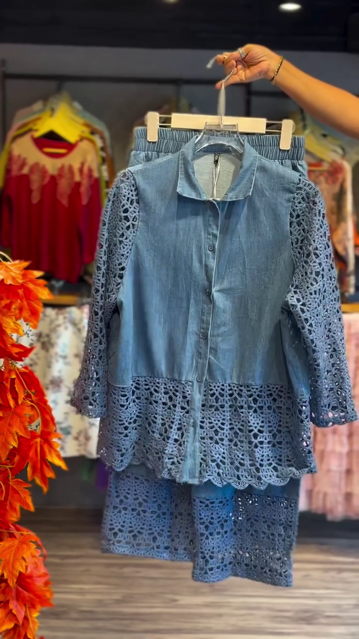 The Azure Lace Harmony Denim Co-ord Set is a beautiful blend of vintage denim and intricate lace artistry 💙. Designed for the modern woman who loves subtle sophistication, this set features a button-down denim tunic top with exquisite crochet lace detailing along the hem and sleeves.