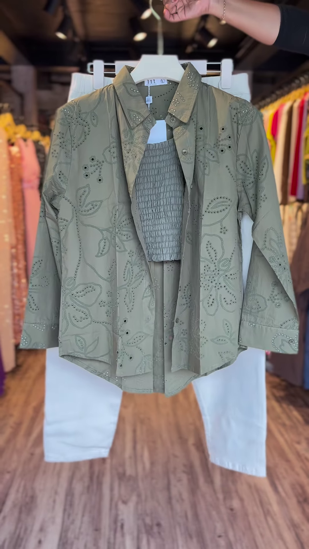Slay the season with this effortlessly cool co-ord set that blends minimalism with glam ✨. The olive green shirt-style top comes with eyelet cutwork embroidery 🌿 and scattered mirror work ✨, adding just the right amount of shine. Paired with a smocked tube top underneath, it gives you that relaxed but put-together vibe.