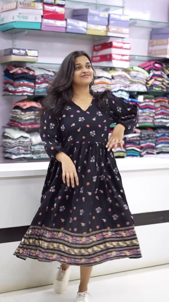 Embrace grace and style with this black floral printed midi dress, a wardrobe essential for every modern woman. Crafted from soft rayon fabric, it features delicate floral motifs and a flared hemline that flows beautifully with every move. πΊπΏ