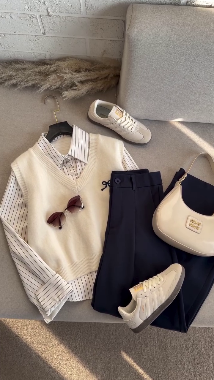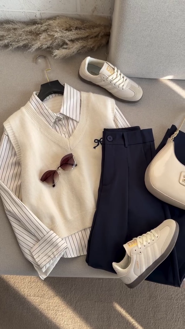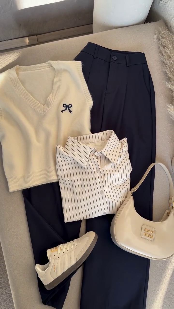 The set features a premium cream V-neck knit vest with a cute mini bow embroidery ๐, paired with a striped button-down shirt for that polished office/college aesthetic ๐. The look is completed with high-waist wide-leg trousers in a rich deep navy/black tone โ giving you that sleek tall silhouette and elegant fall ๐๐ฅ.