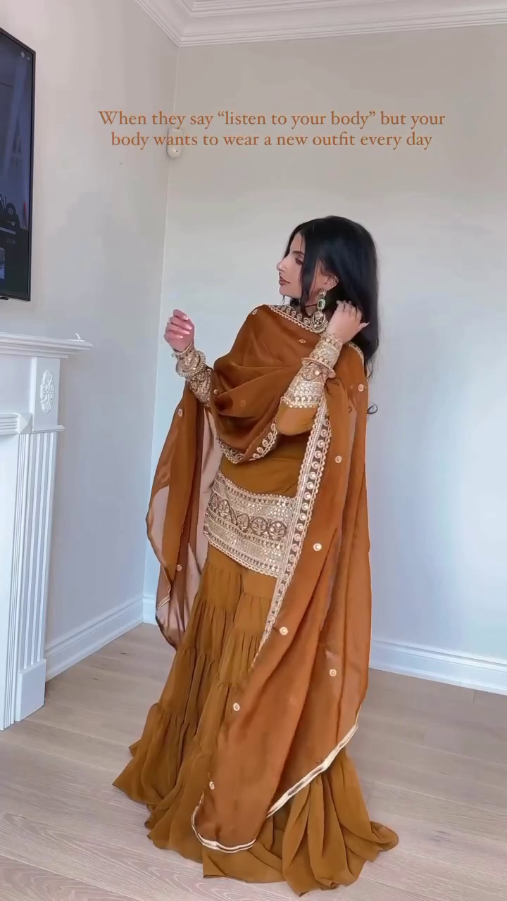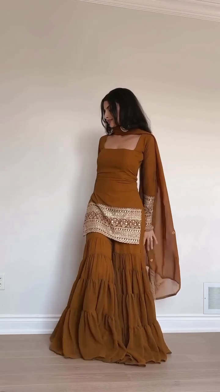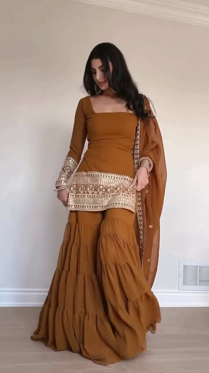 Exude regal grace in the Amber Glow Embroidered Sharara Set ✨—a mesmerizing fusion of earthy tones and intricate craftsmanship. This rich amber-brown ensemble features a square-neck peplum kurta detailed with golden threadwork and traditional motifs.