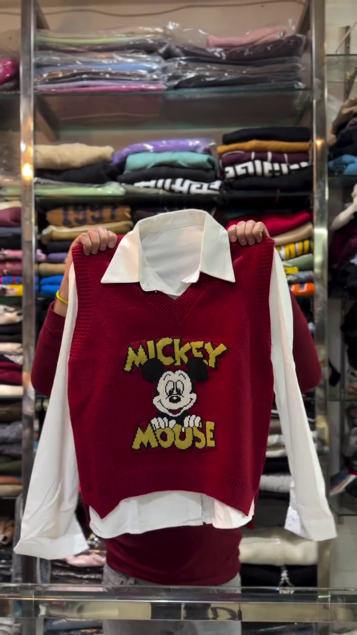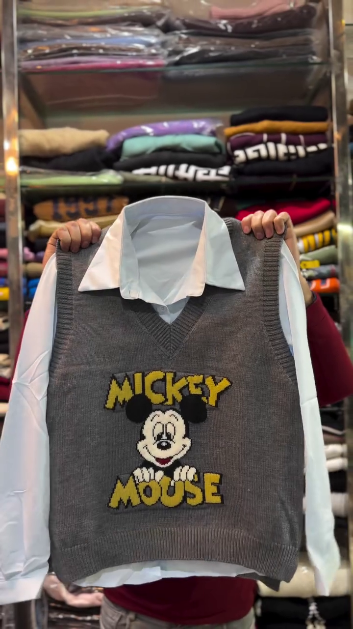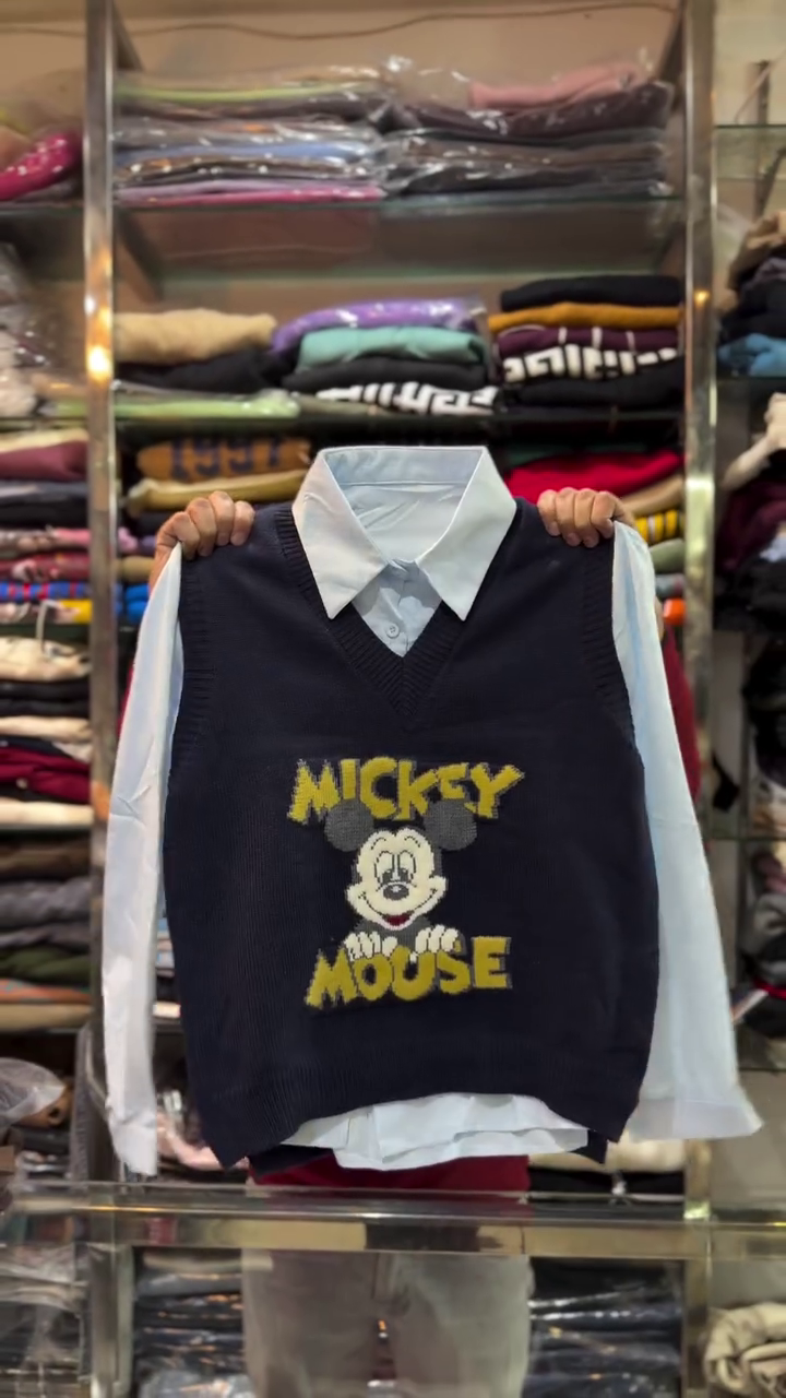 This stylish outfit features a soft knit sleeveless vest layered over a classic full-sleeve shirt, giving you a smart, ready-to-style look in one piece 🤍. The vest showcases an adorable Mickey Mouse knit design with bold lettering, adding a fun and youthful vibe that instantly stands out.