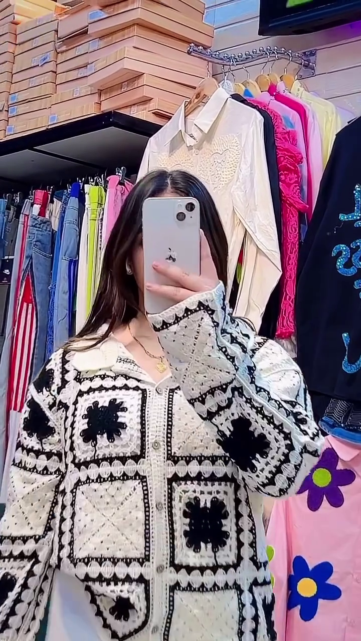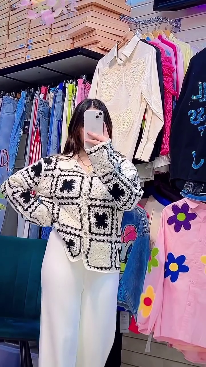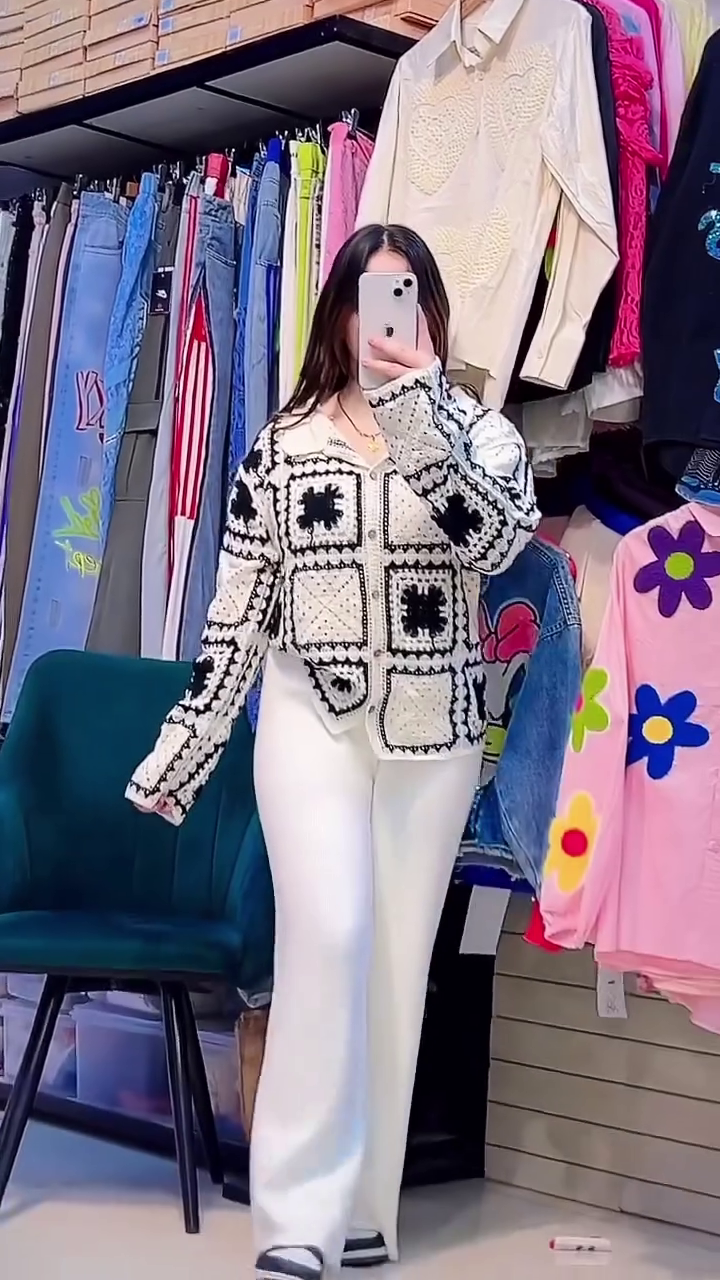 This stylish set features a black and white crochet‑look cardigan 🖤🤍 with bold patchwork squares and front buttons. The design gives a handmade, retro feel while still looking modern and trendy. The cardigan has a relaxed fit and long sleeves, making it super cozy for winter and autumn days. Paired with it are high‑waist white wide‑leg knit pants that create a long, lean silhouette and are comfortable for all‑day wear. The neutral palette lets you mix and match the cardigan and pants with other pieces in your wardrobe easily. This outfit is perfect for shopping trips, café dates, college, or casual office days. Style with chunky sneakers or boots, a crossbody bag, and minimal jewelry for a complete chic look. ✨
