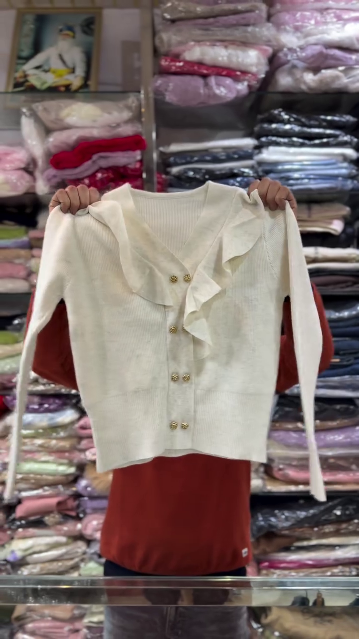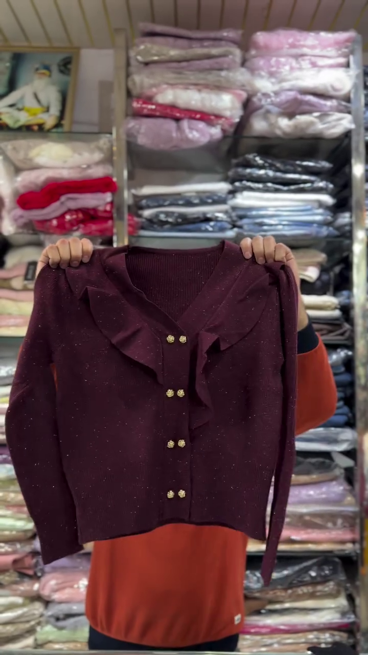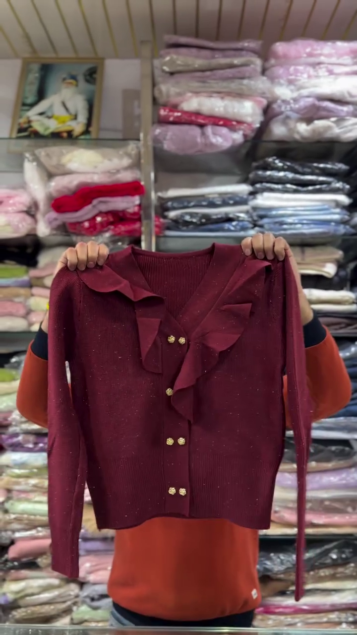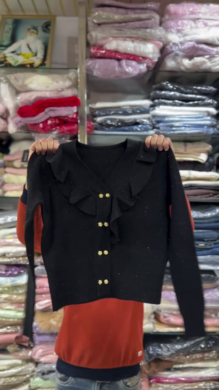 This chic black knit cardigan 🖤 is designed for those who love timeless style with a feminine twist. The front features layered ruffle detailing along the V‑neck and button placket, creating soft movement and a romantic feel. Gold‑tone buttons ✨ run down the center, adding a luxurious touch that elevates even simple outfits. The slim yet comfortable fit flatters the body, and the full‑length sleeves keep you warm during cooler seasons. Tiny specks in the knit give a subtle sparkle effect, making this piece perfect for dinners, parties, or elegant daywear. Style it tucked into skirts or worn over dresses, or pair with jeans and heels for an effortlessly sophisticated look. This cardigan transitions easily from office to evening events.