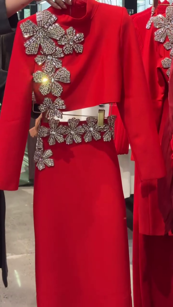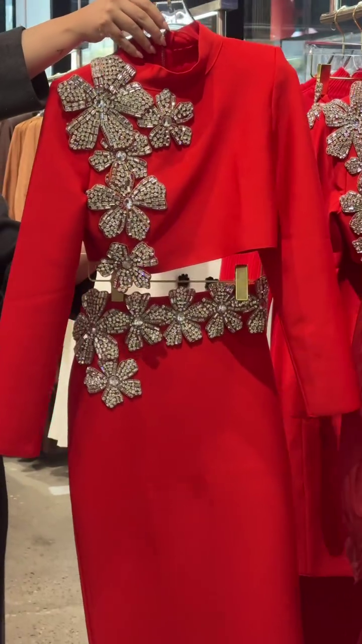 This stunning red occasion gown 🔴 is a true show‑stopper, perfect for receptions, cocktail nights, and high‑glam events. The dress features a sleek, body‑skimming silhouette with long sleeves and a modest neckline for balance. Over the gown sits a coordinated crop‑length overlay top, creating a layered designer look. The highlight of this piece is the heavy crystal floral embellishment 🌺✨ cascading diagonally from the shoulder across the bodice and around the waist. Each flower is crafted with sparkling stones that catch the light from every angle, giving you a glamorous, red‑carpet effect. The rich red fabric provides structure while still allowing comfortable movement, ideal for walking and posing for photos. Pair this gown with minimal jewelry, high heels, and a clutch to keep the focus on the intricate embellishment.