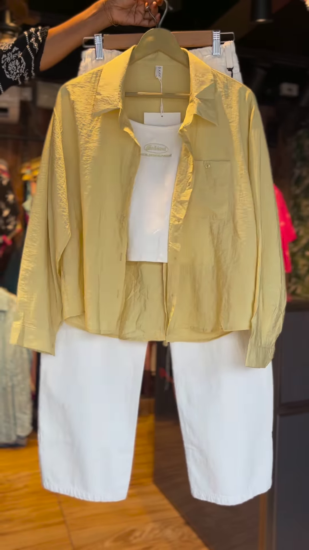 Minimalist, breezy, and effortlessly cool — the Lemon Light coord set is what you reach for when you want comfort that still turns heads. With a soft pastel yellow shirt, a white graphic crop top, and easy-fit white bottoms, this combo screams fresh starts and iced lattes on patios.