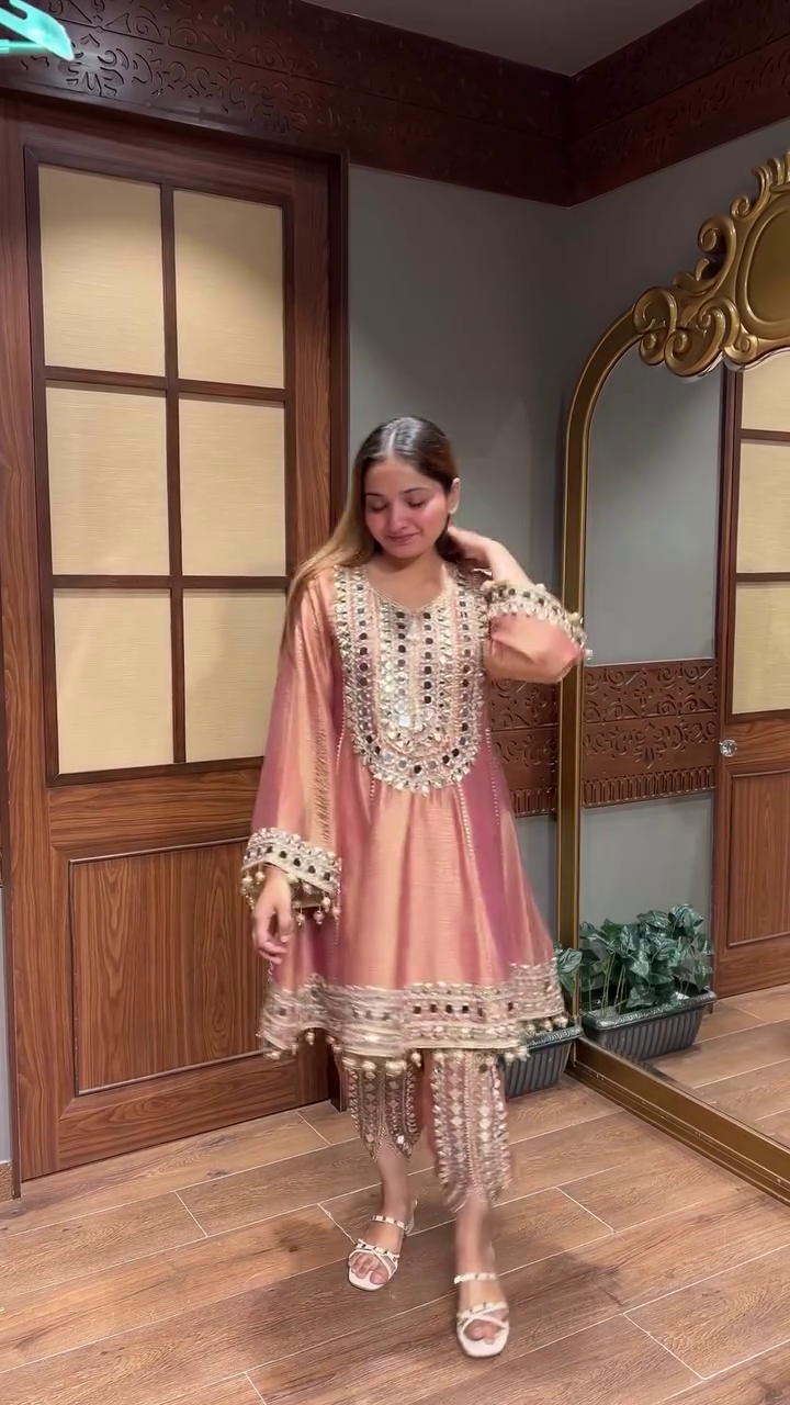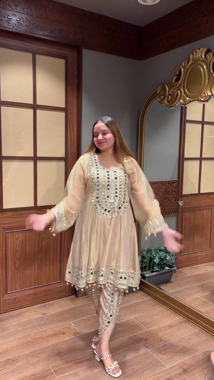 💎 Shine at every celebration in the Premium Gold Mirror Embroidered Organza Party Suit! This stunning set includes a golden A-line kurti lavishly decorated with mirror embroidery in intricate patterns across the bodice, neckline, and cuffs. The organza fabric gives the flowy sleeves and hem a sheer, ethereal look, while the matching pants feature coordinated embroidery and a flattering, tapered silhouette.