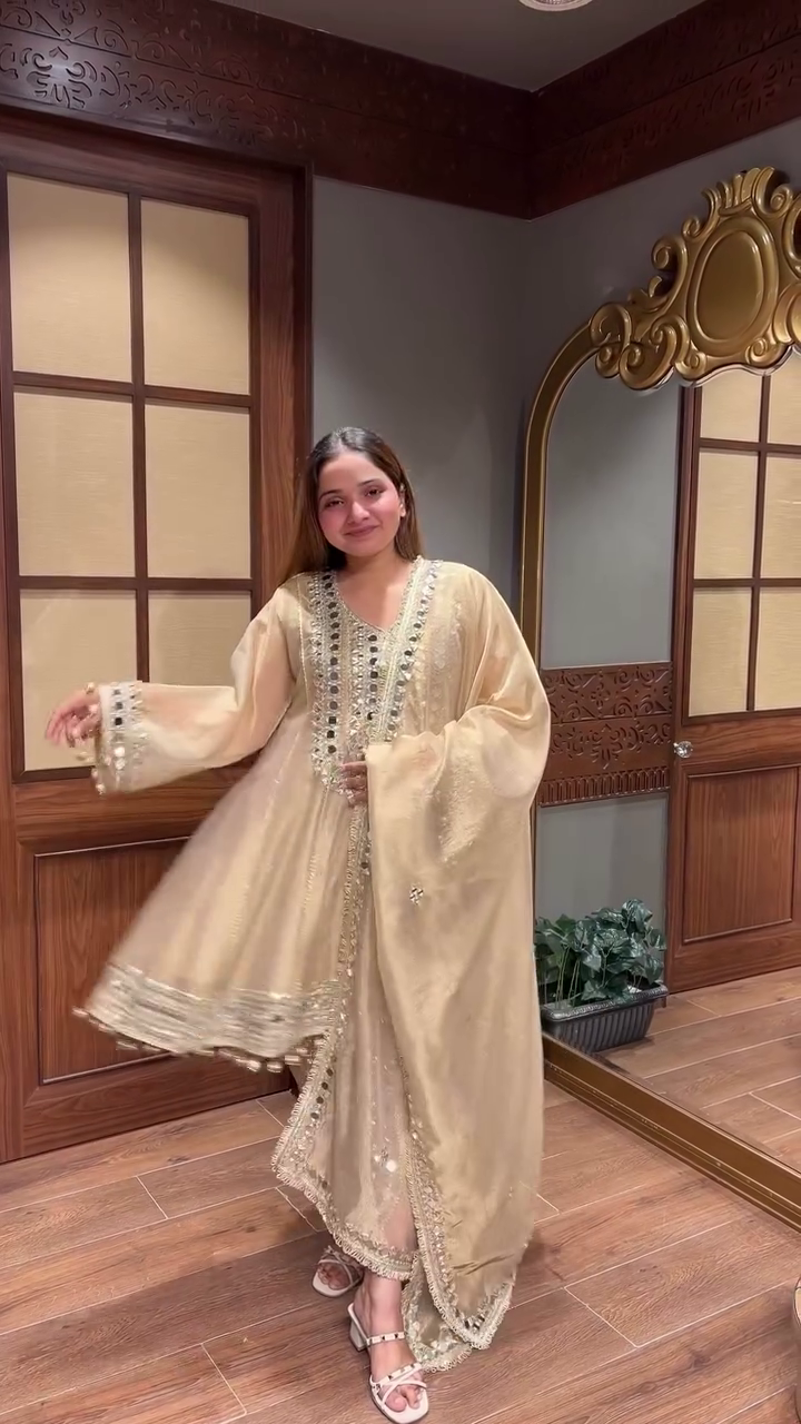 Premium Gold Mirror Embroidered Organza Party Suit