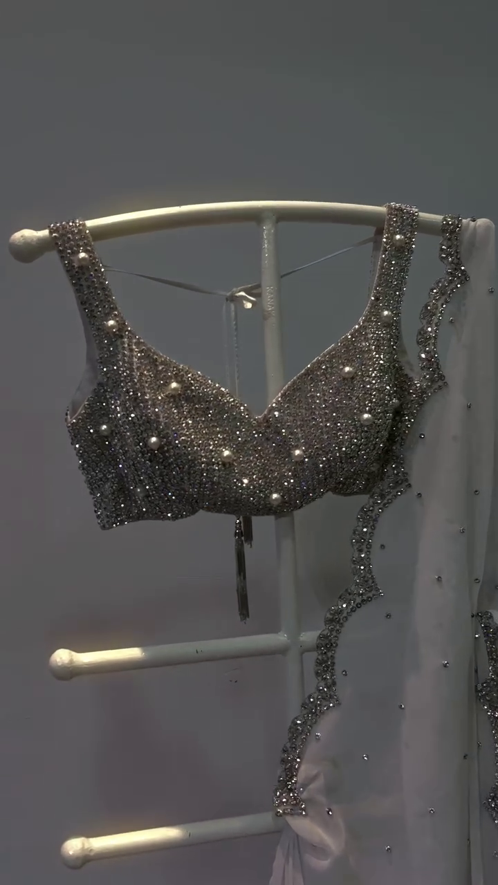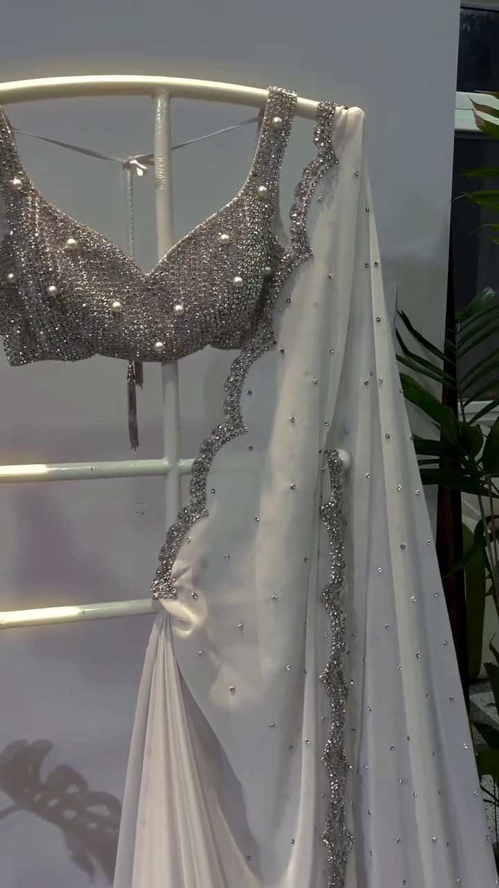 🤍 The Silver Crystal Hand-Embroidered Blouse and Pure White Net Saree Set with Stone Studded Border is pure sophistication, reimagined for contemporary saree lovers. The sleeveless blouse features intricate, shimmering hand embroidery and glimmering crystals, while the pure white net saree drapes elegantly and is delicately dotted with crystals throughout.