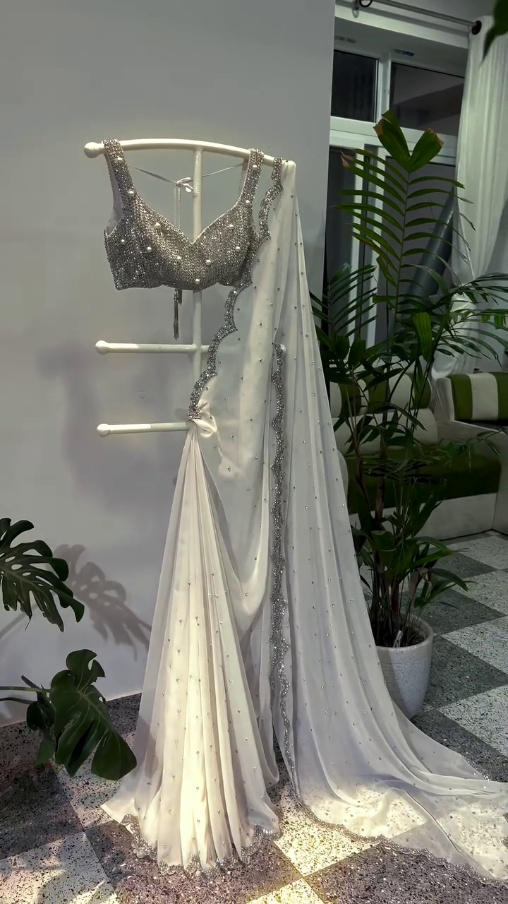 ✨ The piece is highlighted by an embellished scalloped border, adding luxury and grandeur. Ideal for cocktail parties, receptions, or stylish festive gatherings, this saree brings both drama and poise. Pair it with silver stilettos and minimal jewelry for a regal, ethereal effect.