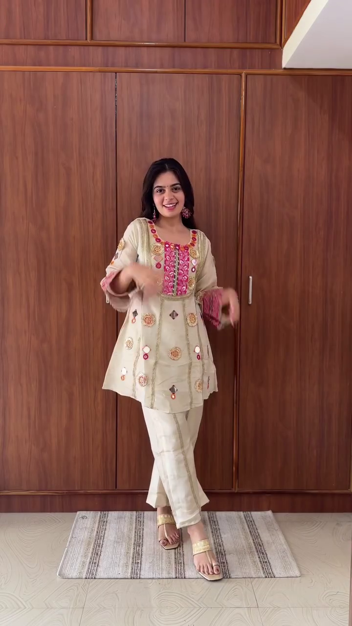 ✨ The kurta boasts a striking panel of vibrant pink and gold embroidery running down the front, detailed with intricate threadwork, shimmering mirror embellishments, and gota patti borders. The neckline and cuffs are lavishly accentuated with circular mirror motifs and sparkling gold threads, while sequin-studded pink fabric on the sleeves gives the outfit a regal touch. The straight, relaxed silhouette ensures comfort and a flattering fit for all body types.