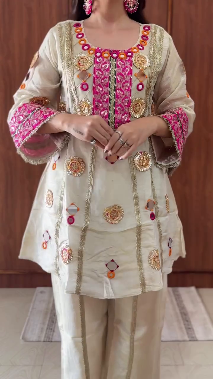 🌸 Experience celebration in every stitch with the Traditional Ivory Silk Straight Kurta Set featuring Pink-Gold Mirror Embroidery, Gota Work, and Festive Mirror Appliqué Accents Paired with Coordinated Palazzo Pants! This radiant ensemble is crafted from rich, ivory silk fabric, offering a luxurious drape and elegant shine suitable for any festive occasion or cultural gathering.