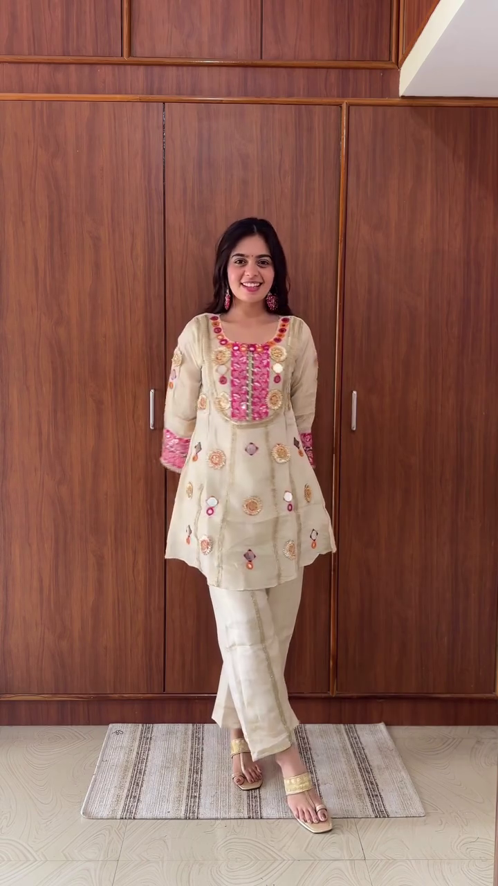 🌿 The accompanying palazzo pants are tailored from the same soft ivory silk and embellished with matching vertical gota lines and embroidered designs, maintaining a cohesive and graceful appearance. This set is lightweight, breathable, and ideal for dancing or socializing during festive events like Karva Chauth, Rakhi, or weddings.