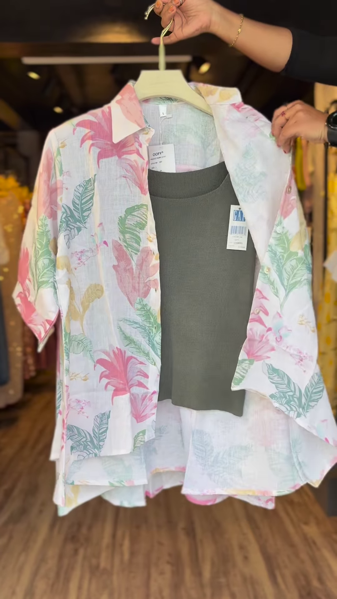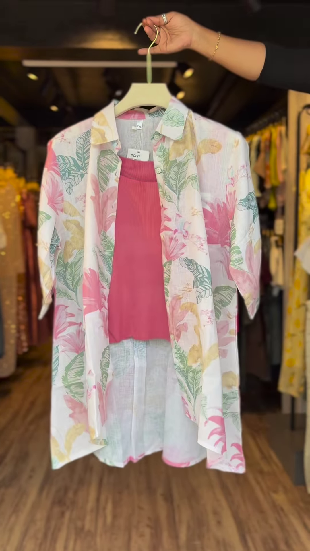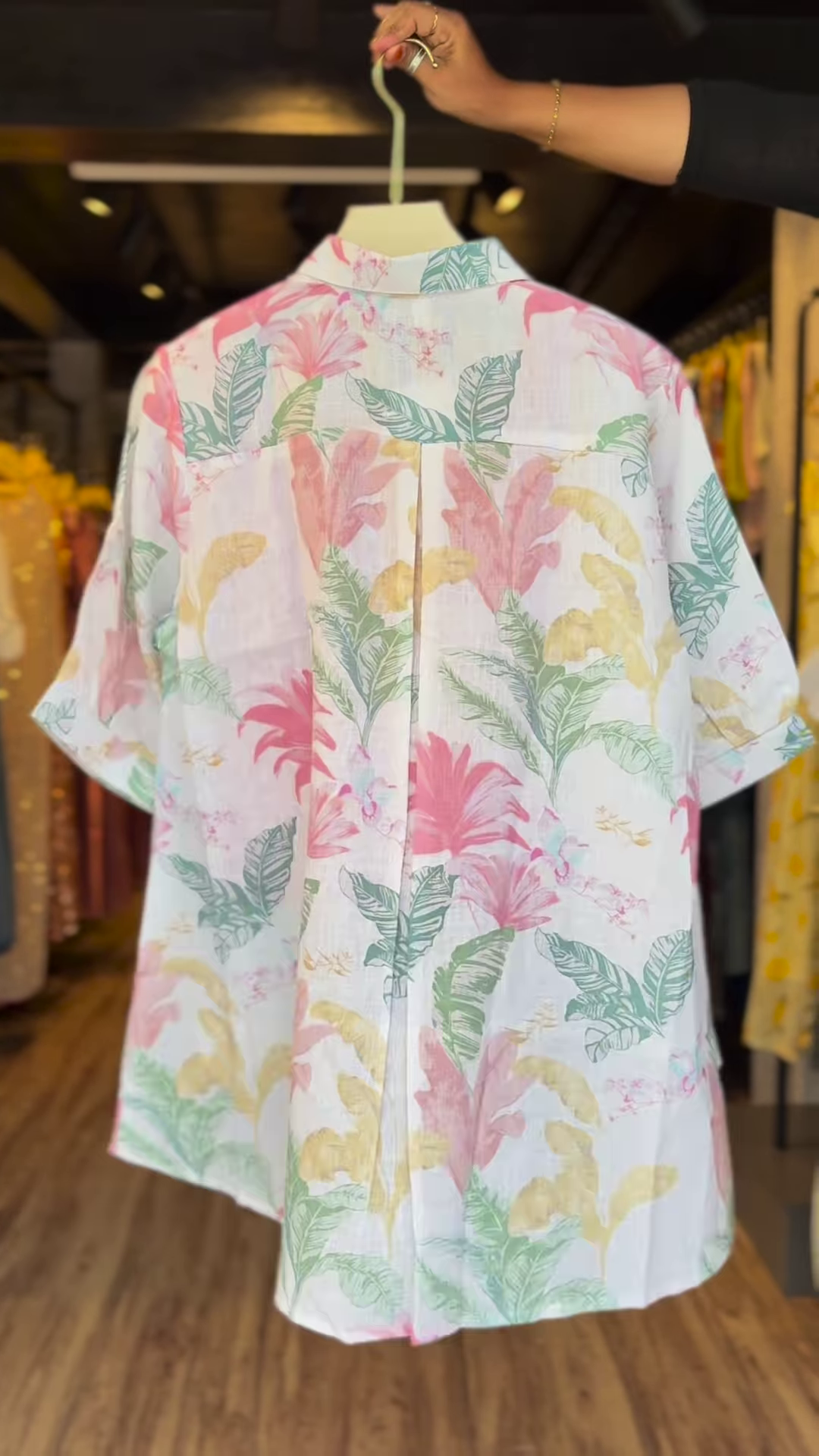 The outer shirt features a relaxed, flowy silhouette adorned with vibrant tropical leaf prints in shades of pink, green, and yellow — giving you a fresh and lively look. Crafted with breathable cotton-blend fabric, it keeps you comfy all day whether you’re brunching with the squad, strolling by the beach, or running casual errands.