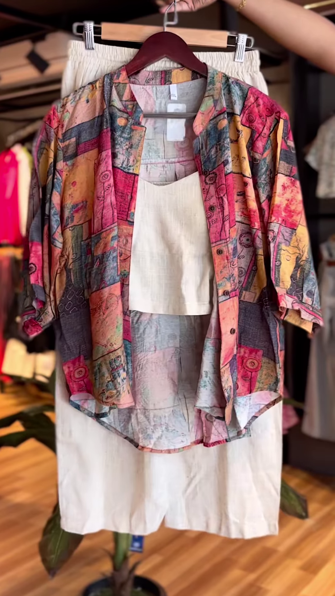 The riot of vibrant shades in the outer shirt contrasts beautifully with the neutral tones of the crop top and pants, creating a balanced yet lively outfit. The painterly prints evoke a handcrafted charm that’s both urban and artsy.
