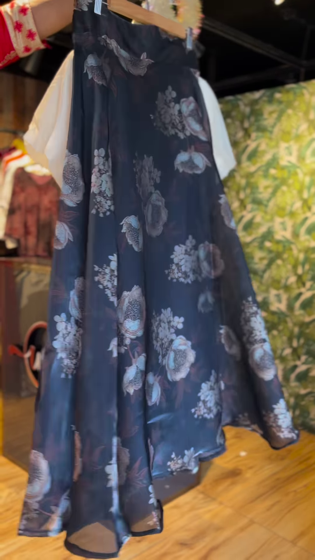 • A-line black floral skirt with soft pleats and flow