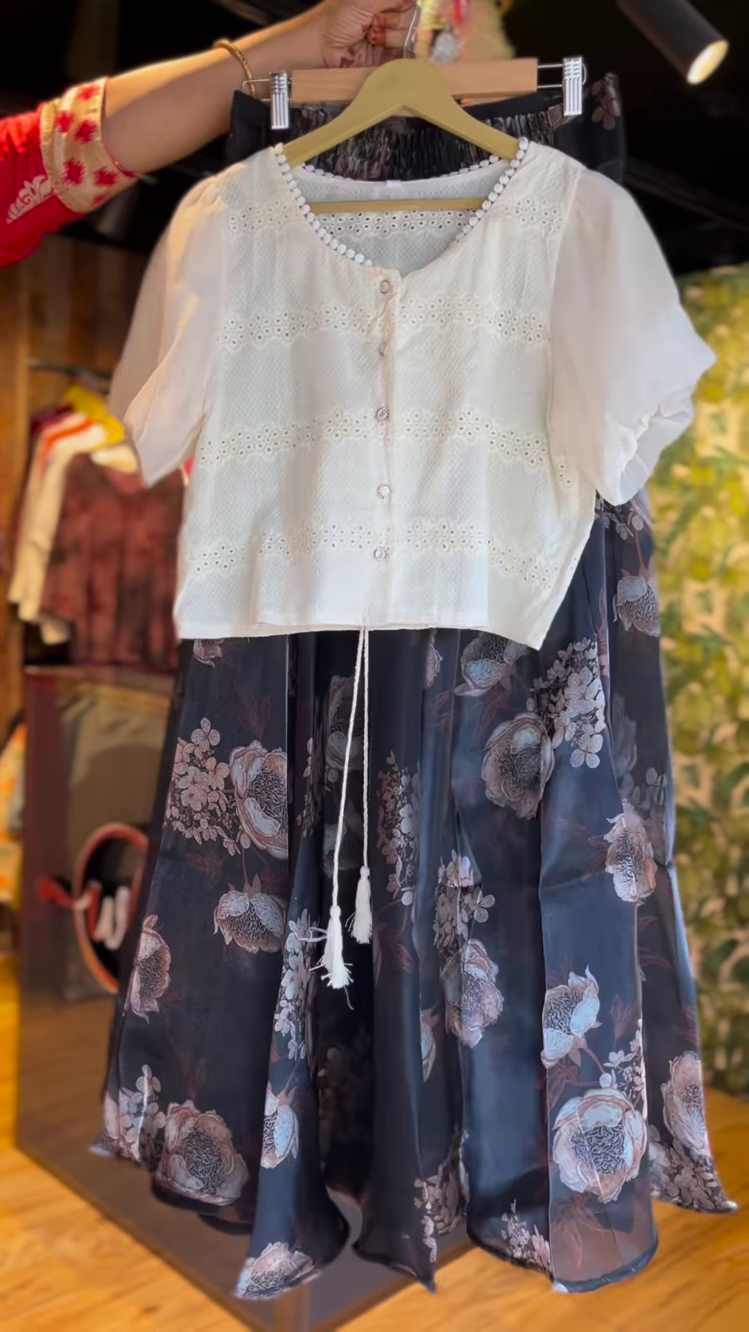 Fall in love with the whimsical grace of the Vintage Bloom Coord Set, featuring a sweet ivory eyelet top with delicate puff sleeves, pearl-like buttons, and tie-up tassels — paired with a flowy, dark floral midi skirt that moves with the breeze.